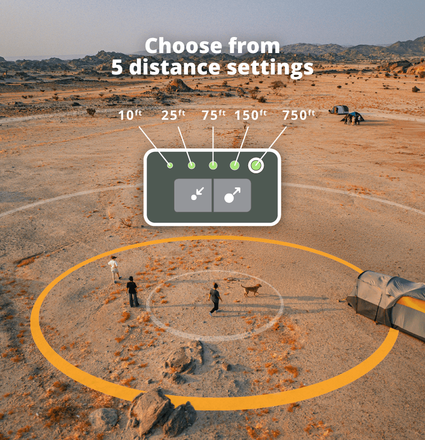 No setup required. Unlike GPS fences that need to be configured for each location, Heel™ works instantly wherever you park or pitch. Just turn it on, select your distance, and you're good to go.